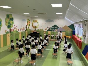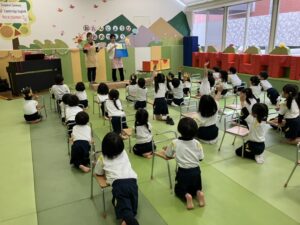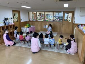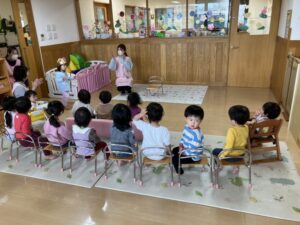 保育者からの出し物では、楽しいお話に子どもたちも大喜びで、笑い声が広がりました。